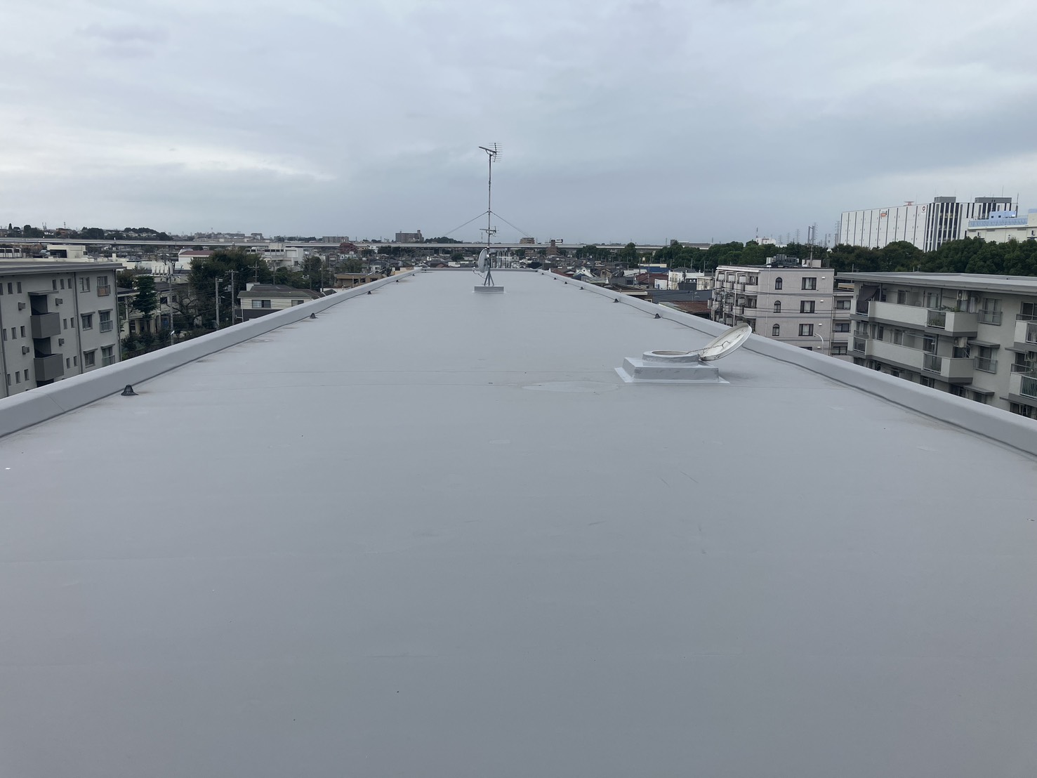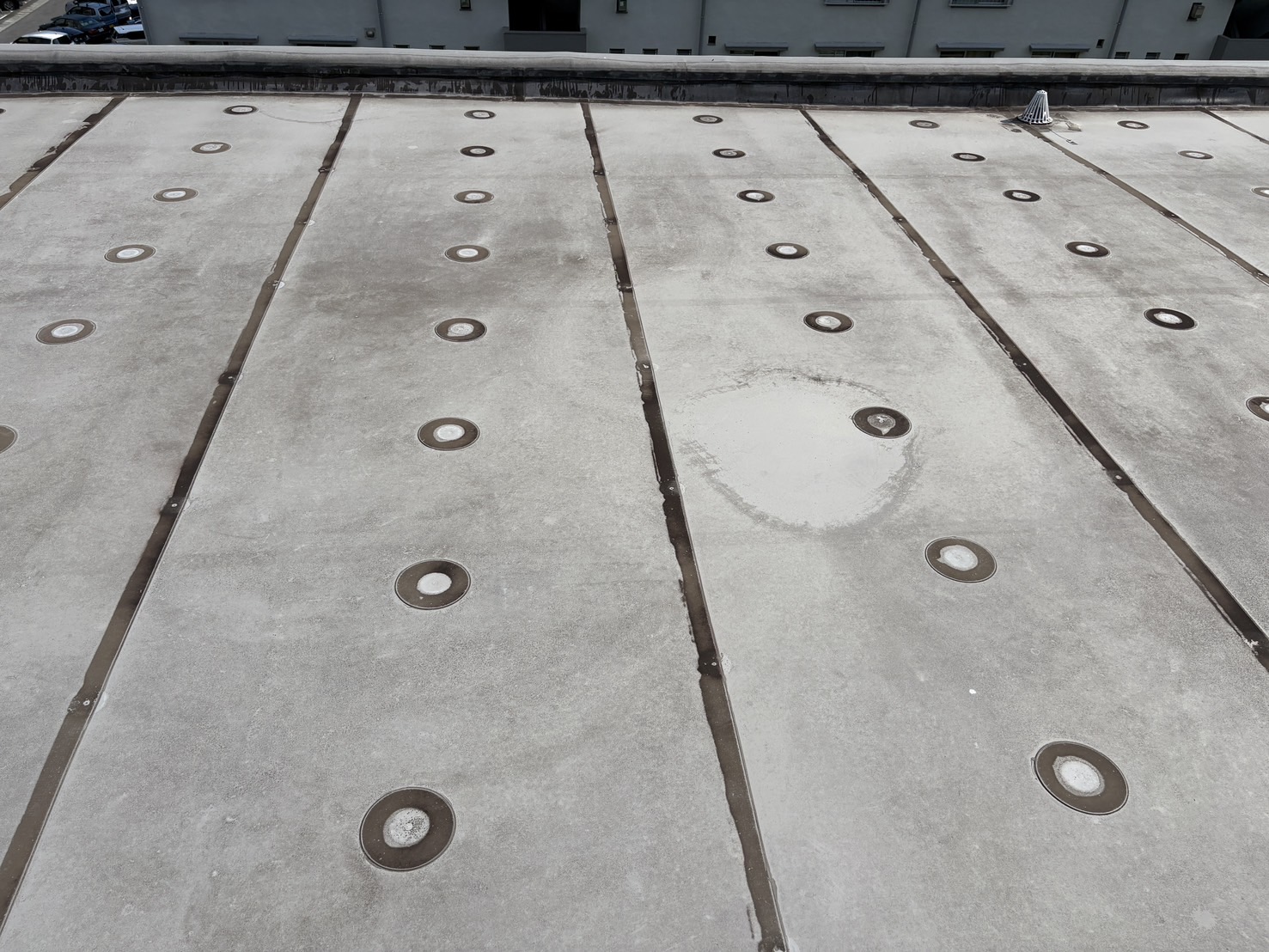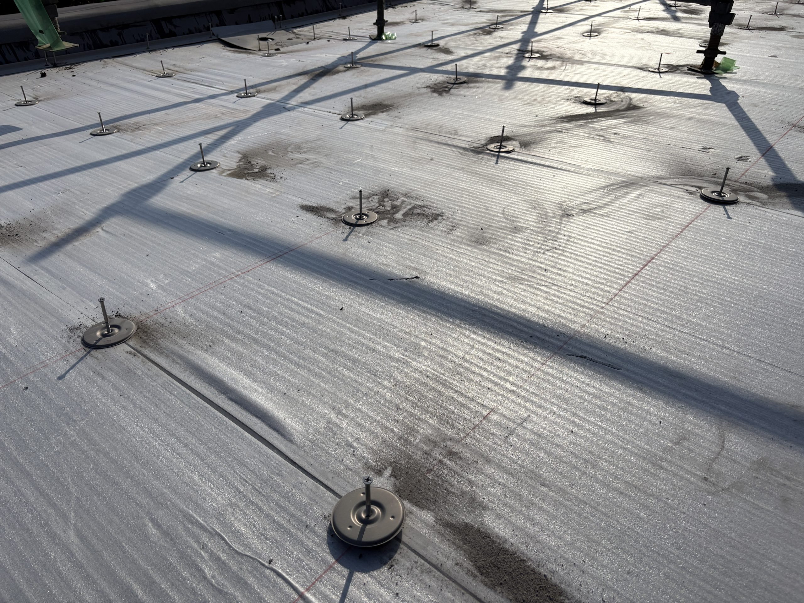 本工事では、塩ビシート防水機械固定工法を実施しました。